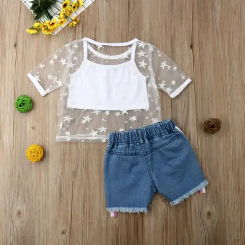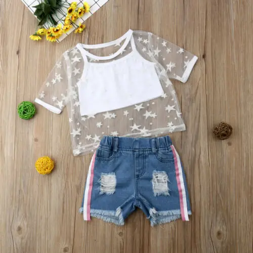 Cheap Offer of 2PCS Kids Baby Girl Clothes Set Fashion Short Sleeve Star Tulle Tops +Destroyed Denim Jeans Shorts