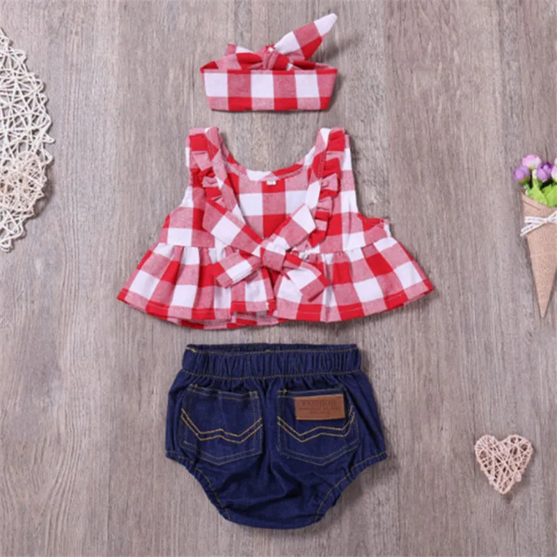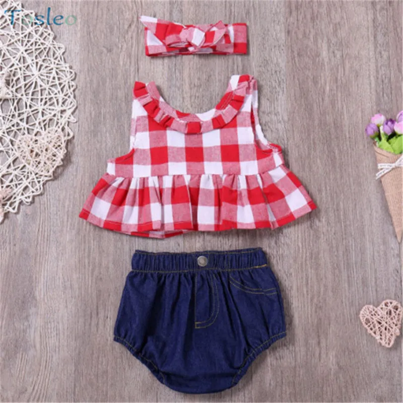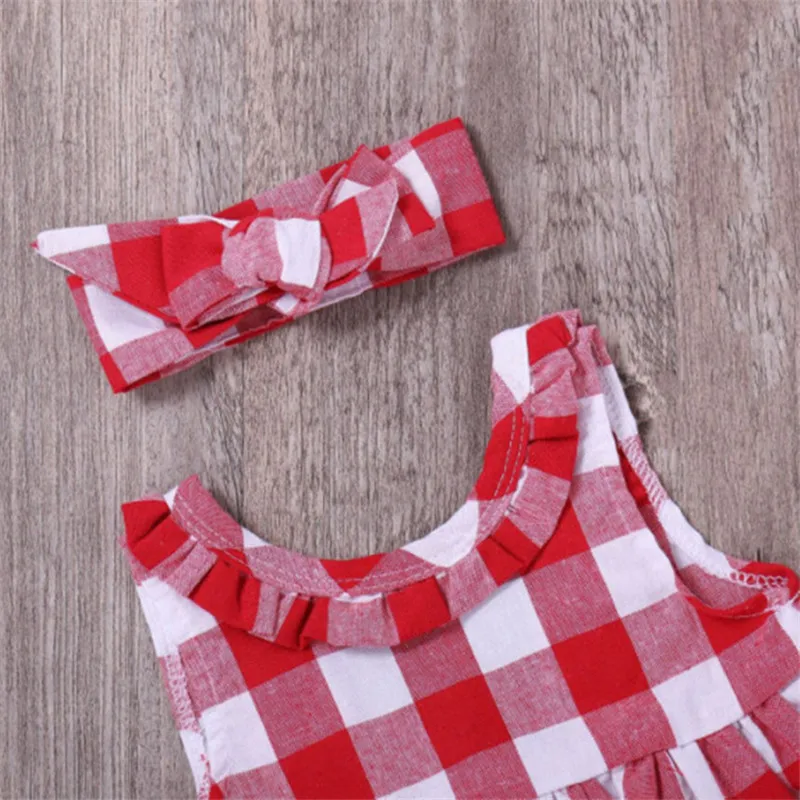 Special Offer of Baby Girl Photography Props Checked Sleeveless Summer Baby Girl Clothes 1PC Headband+1PC Tops+1 PC