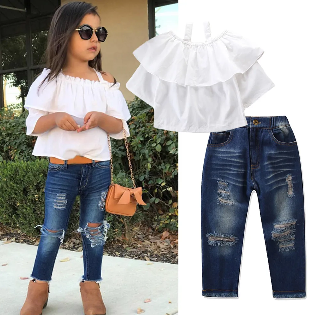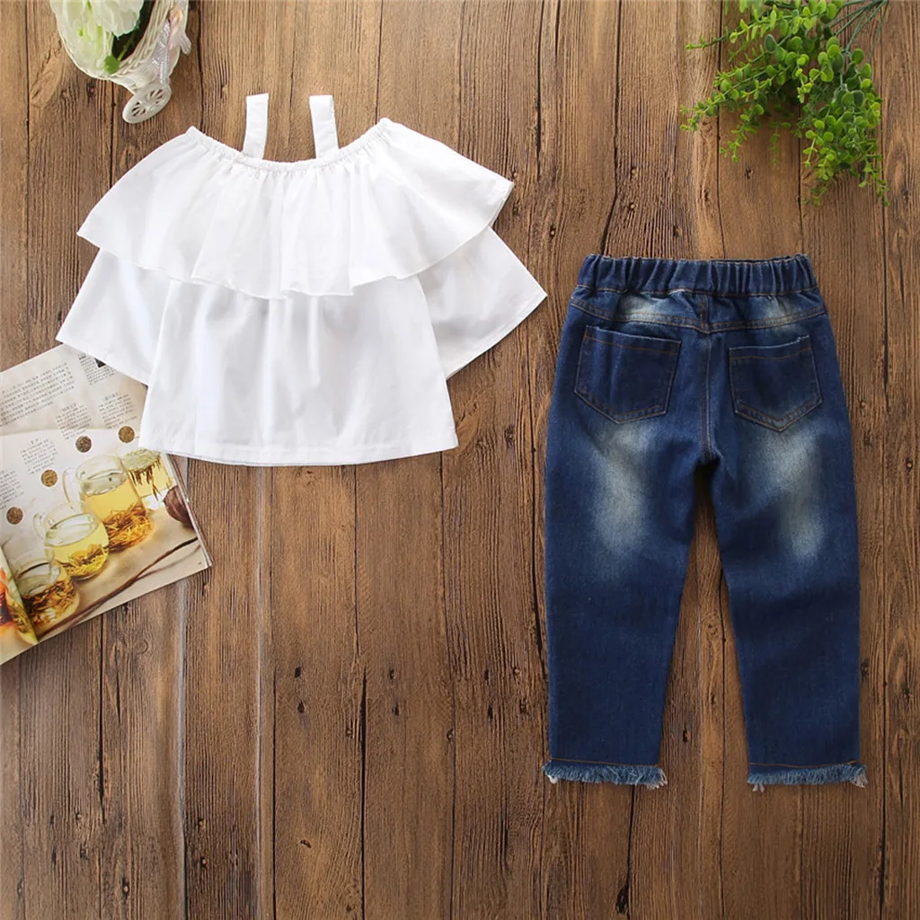 Special Chance of CHAMSGEND Toddler Kids Baby Girls Outfits Off Shoulder T-shirt Tops+Denim Pants Jeans Soft hand fee